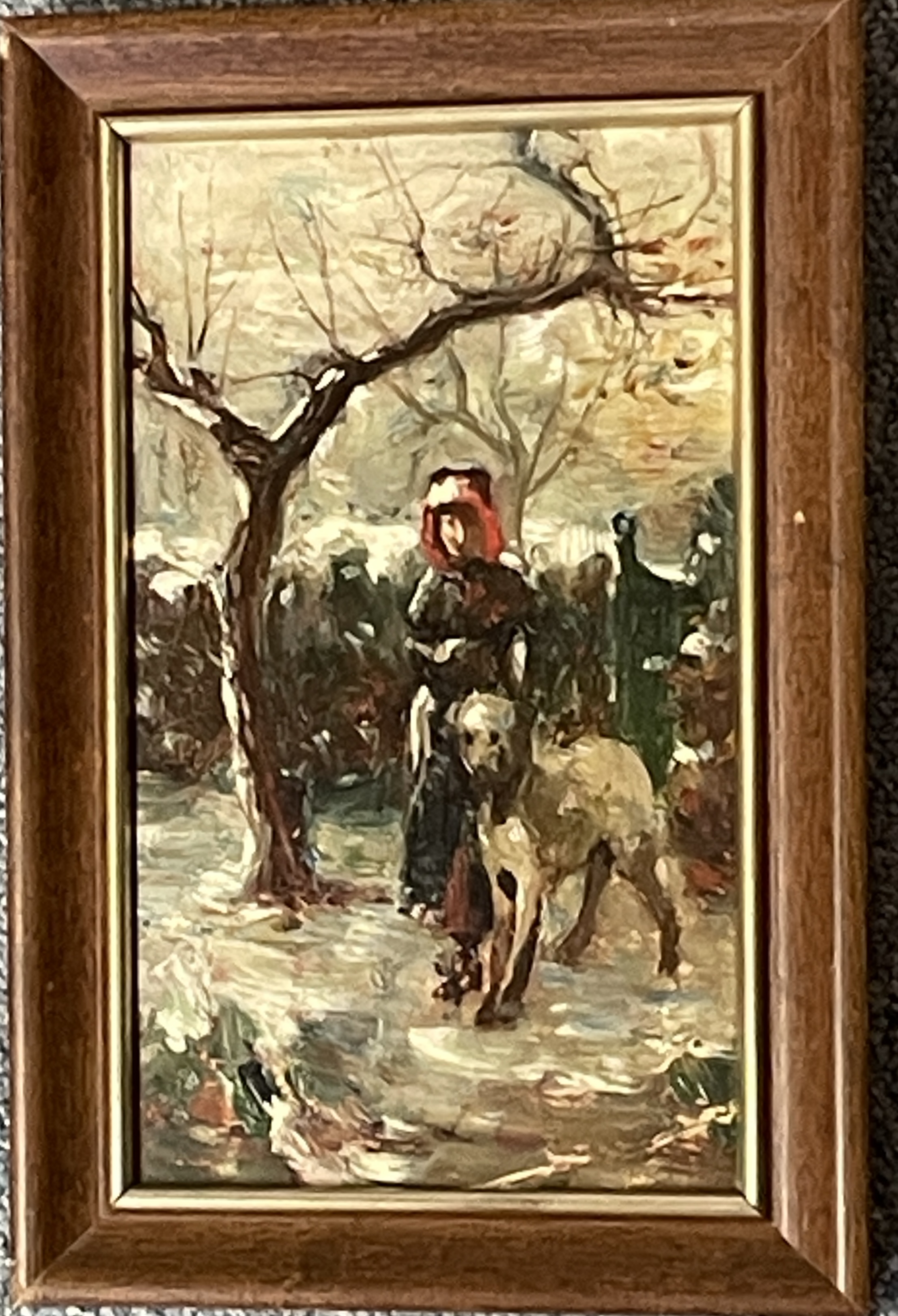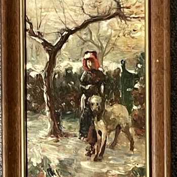 Robert Payton Reid Lady walking Dog Oil on Board Frame: 10” x 6.5” Image: 8.5” x 4.5” Robert Payton Reid (1859-1945) was an Edinburgh-based painter and illustrator. After living in North Queensferry, Fifeshire, Reid returned to Edinburgh to hone his craft at the Royal Scottish Academy schools. From there he traveled to Munich, Germany and Paris, France in the 1880s. A member of the Royal Scottish Academy, Reid traveled extensively through Europe during his career. While renting an art studio in London he became friends with famous Pre-Raphaelite artist John William Waterhouse (1849 – 1917) , who influenced Reid’s style. Upon returning to Scotland, Reid was one of the founders of the Scottish Society of Artists. Reid’s expertise in painting landscapes, and nostalgic country scenes was masterful.