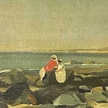John Nicolson RBA RSW (1891-1951) Beach Scene with Lovers Oil on Canvas laid to Board Signed Frame: 12” x 14” Image: 9” x 12” John Nicolson (1891-1951) was the son of the artist Alec Nicolson and was born in London. He studied at St.Martins School of Art and exhibited widely, RSW 33 times, RBA 29, RA 12, ROI 2, RHA13 ,RSA 20 etc. He was elected to the, RBA 1929, ARE 1923 and the RSW 1930 and was awarded a silver medal at the Paris Salon in 1946. Lived in Streatham, London.